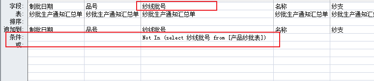 WHERE (((纱批生产通知汇总单. 纱线批号) Not In (select 纱线批号 from [ 产品纱批表])));