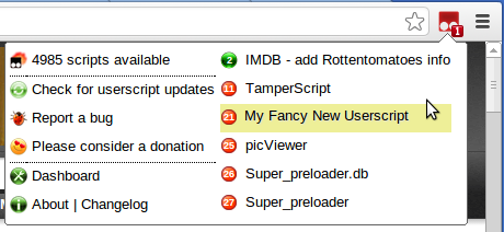Tampermonkey 使管理您的用户脚本变得非常简单。位于右上方的 Tampermonkey 图标显示正在运行的脚本的数量, 单击图标就可以看到正在运行的脚本和可能在这个网页上运行的脚本。(视频教程)